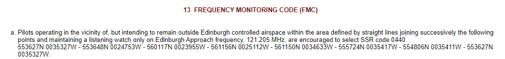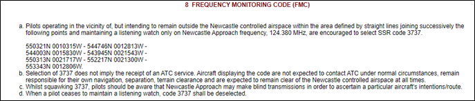 Use the appropriate FMC (Listening Squawk) and listen out. The airspace below the CTA‐2 is Class G airspace (uncontrolled). There is no requirement to receive a service from either Bournemouth ATC (to the west) or Southampton ATC (the controlling authority). However, the introduction of the Frequency Monitoring Code (7011 for Southampton/Solent Radar – 120.230MHz, or 0011 for Bournemouth Radar 119.475MHz) enables ATC at those units to observe an aircraft that may be of potential conflict to their traffic inside controlled airspace and interrogate such an aircraft when appropriate. The use of this FMC has been proven to prevent infringements and reduce the severity of such occurrences and enhance the controllers’ and pilots’ situational awareness creating a safer and more predictable situation than would otherwise prevail. The agreed ‘demarcation’ line between the Solent and Bournemouth FMC is a line orientated northwest to southwest between Stoney Cross and Hurst Castle; to the west it is Bournemouth (0011/119.475MHz) and to the east is Solent Radar (7011/120.230MHz).
