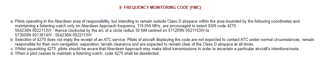 On the leaving the LFA/ATZ to the South and/or operating around Farnborough, pilots are encouraged to obtain an Air Traffic Service (ATS) from Farnborough Radar on 125.250 MHz or to monitor 125.250 MHz and squawk the Frequency Monitoring Code of 4572.