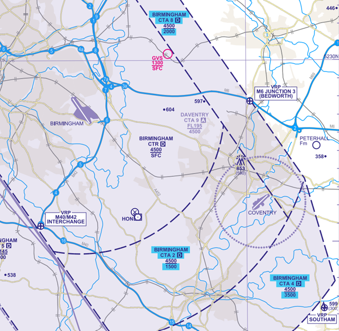 Following consultation with the Birmingham Local Airspace Infringement Team, the CAA, and a review of infringement data, Birmingham Airport has taken the decision to remove the M40 J15 Warwick VRP (with effect from 10 September 2020). The 1:500,000 and 1:250,000 VFR charts will be amended when re-issued. Pilots are reminded that routing to the south of Royal Leamington Spa will prevent an infringement of CTA-2.