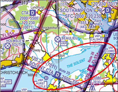 Hurst Castle lies to the south of CTA‐2 and under CTA‐8 with a base of 3,500 feet amsl (on the Solent QNH).