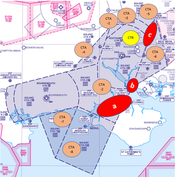 The Solent airspace comprises the Southampton Control Zone (CTR, surface to 2,000 feet amsl) and eight Solent Control Areas (CTA) as depicted in Chart 1. The CTA‐2 portion of the Solent CTA extends from 2,000 feet to 5,500 feet and also above the CTR to 5,500 feet amsl. Southampton in subject to over 100 airspace infringements during a year the majority of which are in CTA‐2.