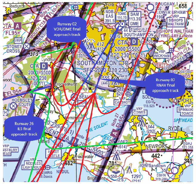 Chart 2: Typical inbound routes using CTA‐2 (Southampton routes for Runway 02 in Red – Bournemouth routes for Runway 26 in Green)