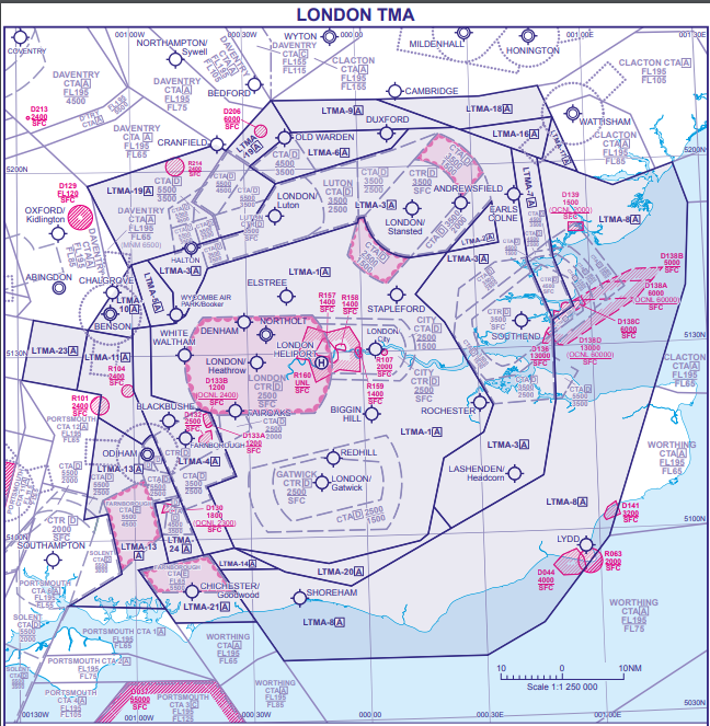 The Farnborough CTA-1 is a small portion of airspace (of only 500 feet) that sits below the base of the London TMA. Farnborough standard arrival (STAR) and standard instrument departure (SID) profiles are specifically designed to ensure safe integration with Heathrow Airport and Gatwick Airport departures.