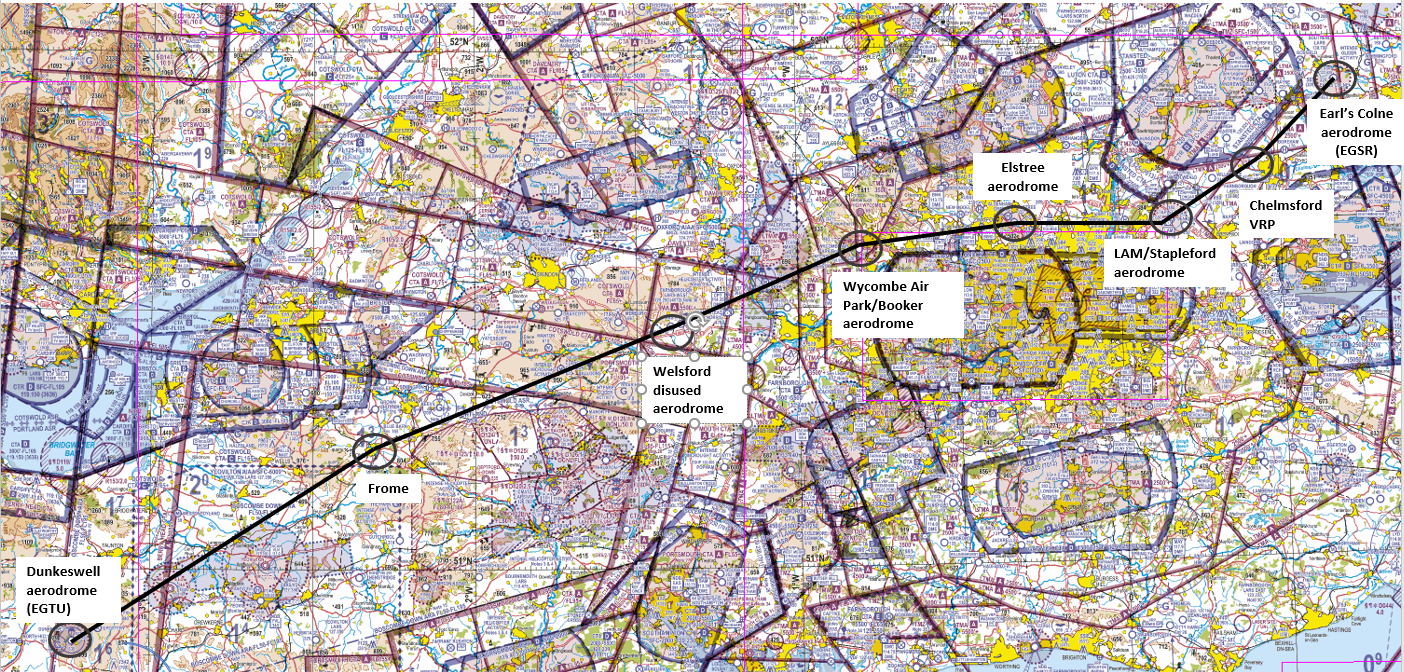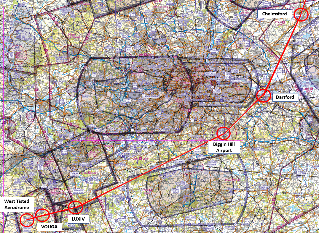 Figure 3: Approximate track of the aircraft after departure from White Waltham represented on the CAA-NATS 1:250,000 Southern England chart (Edition 28).