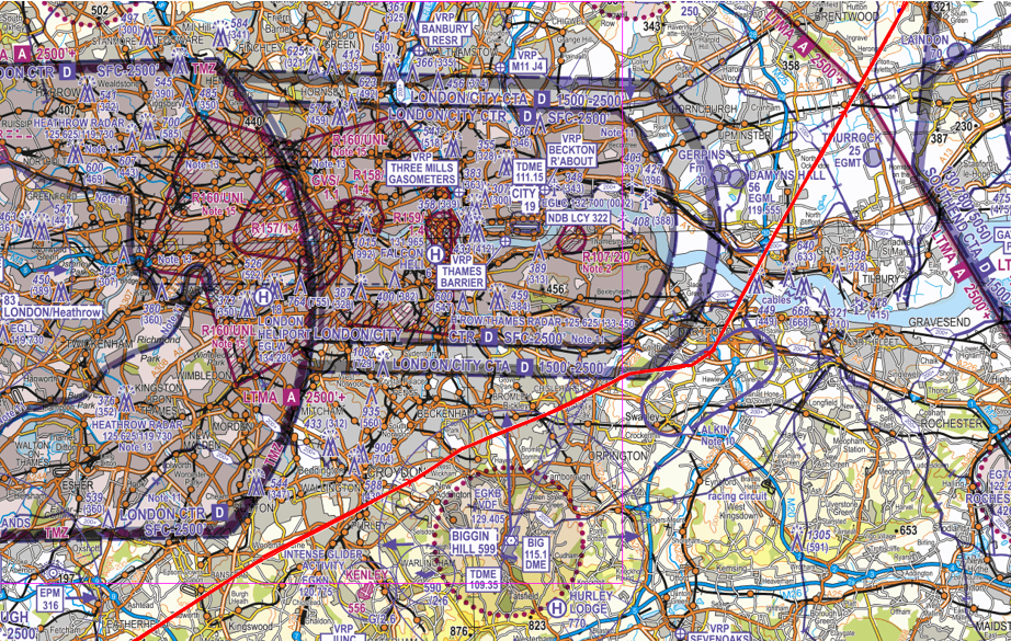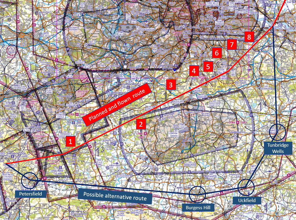The pilot conducted this flight using a VFR Moving Map and a NATS CAA 1:250,000 chart. The pilot had anticipated a routing through the London CTR via Ascot to Biggin Hill however had planned a contingency route via the Farnborough CTR-1. This included headings to be flown to reach each waypoint along the planned route.