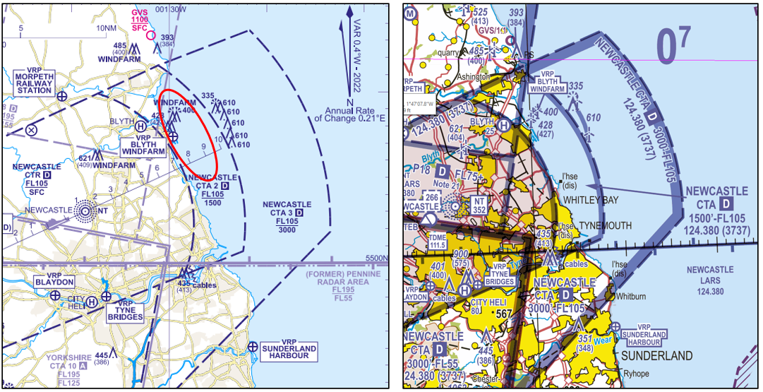 The infringement lasted 9 minutes 32 seconds. Figure 3A shows the area on a 1:500,000 chart. Figure 3B shows the same area on the chart available to the instructor in the cockpit.