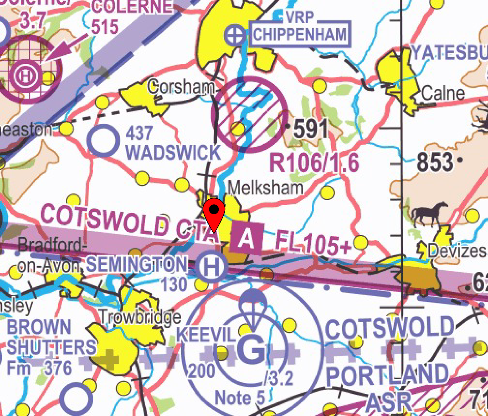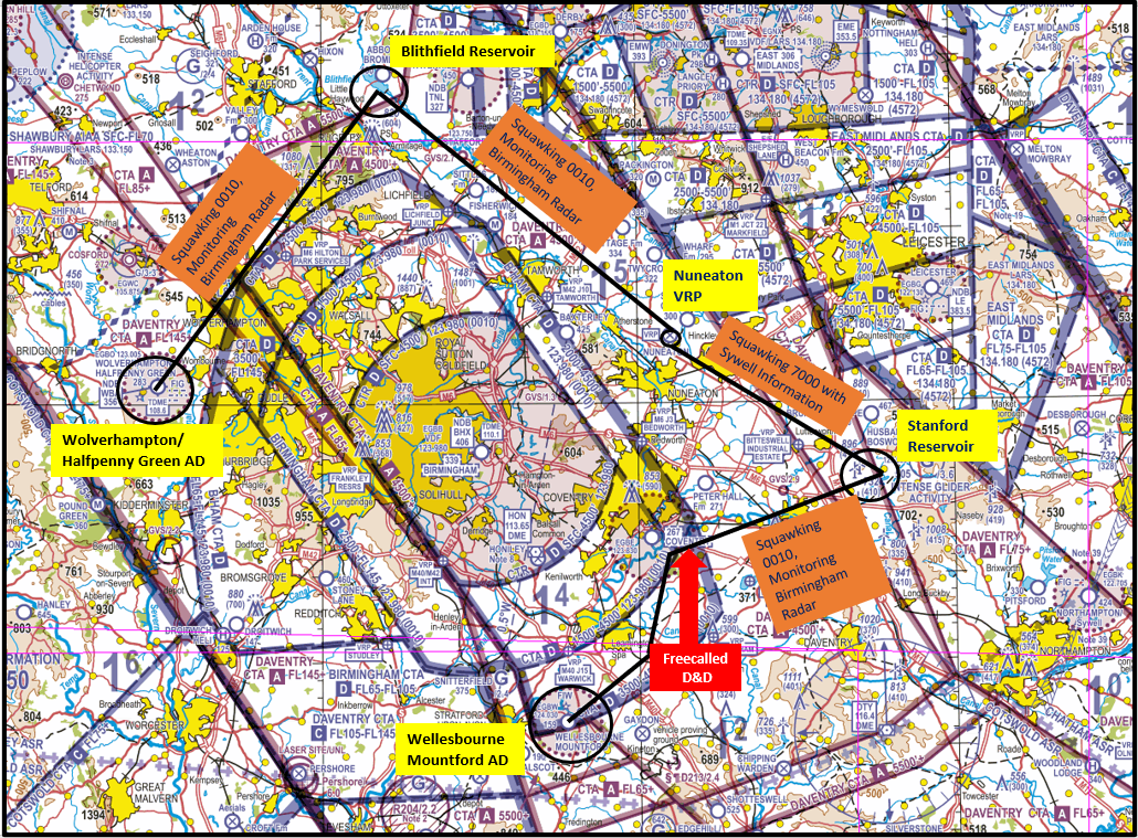 Figure 2: Approximate track of the aircraft through the RMZ represented on the CAA/NATS 1:250,000 Central England and Wales chart (Edition 15, 2023).
