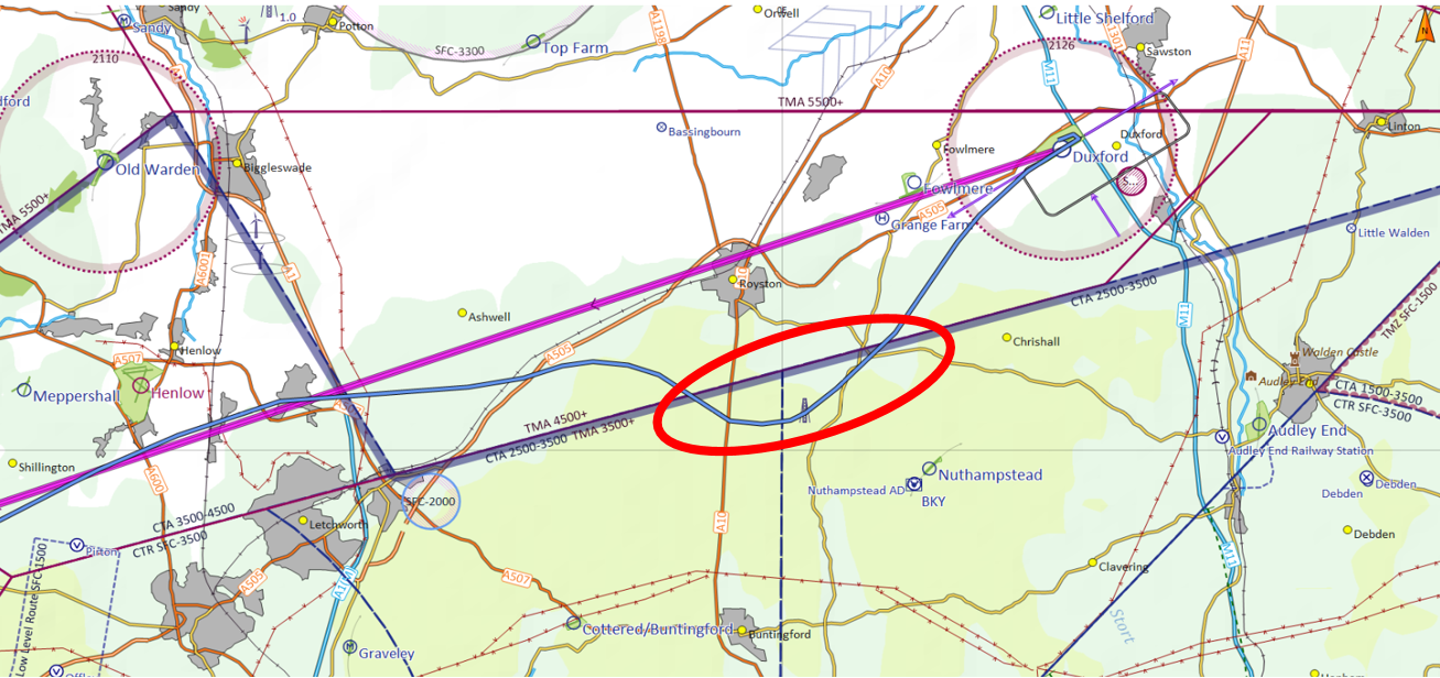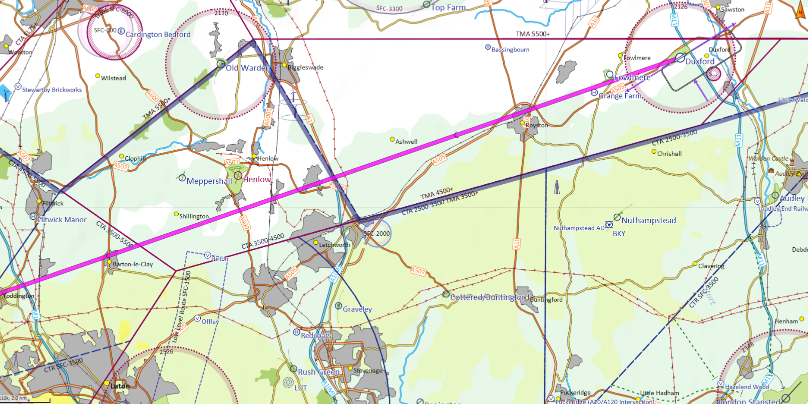 Once clear of Fowlmere, the pilot called Duxford to leave their frequency, changed to Luton Radar on 129.550 MHz and then selected the Luton Frequency Monitoring Code (FMC) of 0013. With the long nose of the aircraft, forward visibility is limited when climbing steeply; unfortunately, that meant fewer visual cues as to actual track were available to the pilot. As the aircraft approached 3,000 feet the pilot asked the passenger to pass them their Moving Map tablet that had been running since departure. The pilot was just noting they had had flown to the left of the airspace line (magenta line in Figure 2) when Luton Radar called to advise that they were indicating at 2,800 feet and was advised immediate descent to below 2,500 feet. Realising their error, the pilot responded that they were descending and turning north to head out of the Stansted CTA as quickly as possible.
