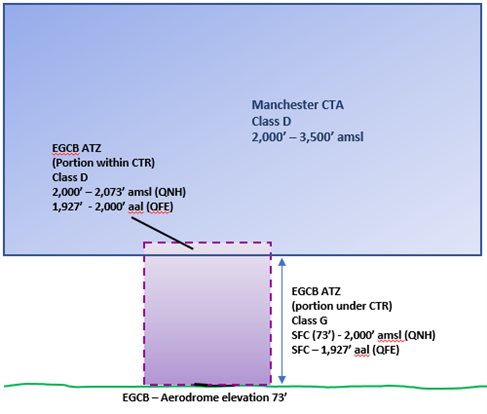 The ATZ lies primarily within Class G airspace; however, the top of the ATZ lies above the base of the Class D Manchester CTA (Manchester Barton aerodrome elevation being 73 feet AMSL). This also means that it is impossible to transit at the top height (2,000 feet AGL) or above the Barton ATZ without clearance from Manchester ATC. Aircraft arriving to and flying visual circuits at Barton will do so on the Barton QFE; departing aircraft will be issued the Manchester QNH.