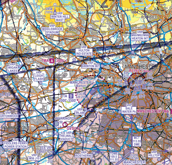 Updated to incorporate changes to the area of the Manchester Control Zone that was formerly the Manchester Low Lever Route and is now the Class G Restricted Area EGR323 – North West Transit Corridor.